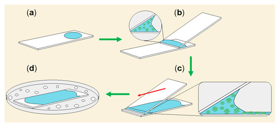 Figure 1. Schematics of the preparation method: (a) a drop of cellulose nanocrystal (CNC) suspension is deposited onto a glass substrate; (b) another glass slide is placed so that the suspension adheres to it; (c) the coater plate is moved to distribute the suspension; (d) the sample is placed inside a petri dish for the slow evaporation of water in a humid environment.
