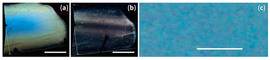 Figure 2a shows an image of a CNC film taken through a left circular polarizer. As can be seen, a bright blue color extends over areas of several cm2 with border effects. In a visual test of the selective Bragg reflection, it is observed that the sample appears dark when viewed through a right circular polarizer, as shown in Figure 2b. This optical chirality is indicative of a of left-handed chiral structure in the CNC film. The reflection of the left-handed polarization implies the transmission of the right-handed complementary polarization. The quantification of these effects is discussed below in Section 3.2. Figure 2c shows a POM image of the center of the film. At this scale, the color domains are blue and cover areas of hundreds of square micrometers. The small variation of the color of the domains is indicative of a small variation in pitch. In summary, although the deposition method used in this work applies a shear stress on the suspension, it is not strong enough to break the tactoids in the chiral nematic liquid crystal phase, but might cause elongation in the direction in which the stress was exerted [7].