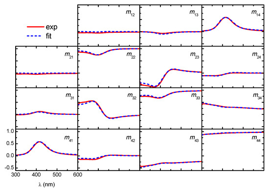 The experimental Mueller matrix in transmission mode at normal incidence shows selective Bragg reflection in a narrow range, as can be noticed in Figure A2 in Appendix A. Data below a wavelength 300 nm were omitted because of the strong absorption of the glass substrate. To highlight the most important features, Figure 4 shows the experimental data (continuous curves) in the range of 300–600 nm. Thus, for unpolarized incident light the transmitted beam is right-handed polarized (m41 > 0) in a band centered at a wavelength of about 415 nm. The latter value agrees with that of 400 nm found for the reflection at θ = 20°, according to Equation (1), taking nav = 1.54 for cellulose [24]. The mean pitch is about 270 nm. Data represented with dashed curves in Figure 4 correspond to the fit described below in Section 3.4.