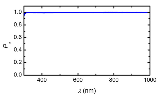 where tr stands for trace. A value of PΔ = 0 corresponds to an ideal depolarizer and PΔ = 1 to a non-depolarizing system. As can be seen in Figure 5, PΔ for M measured in the transmission mode shows that the chiral CNC film practically does not depolarize incident polarized light, because the average value of PΔ is 0.998 ± 0.004. On the other hand, PΔ for measurements in the reflection mode appreciably deviates from unity in the band of selective reflection (Figure A3 in Appendix A).