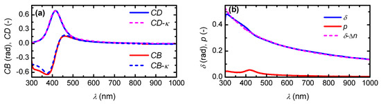 Figure 6. Elementary polarization properties determined from the analytical inversion of experimental Mueller matrix data in Figure 4. (a) Circular dichroism (CD) and circular birefringence (CB). (b) Linear retardance (δ) and linear diattenuation (p). The dashed curves correspond to properties determined using the Tellegen constitutive equations.
