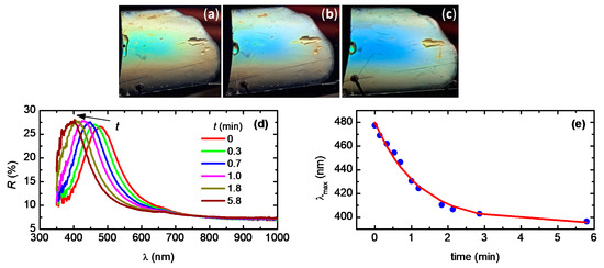Figure 7. (a) Image of a CNC film after immersion in deionized water, (b) after 1.3 min, and (c) after 5.8 min. (d) Time-dependence of the reflectance for unpolarized incident light. (e) Experimental (blue circles) wavelength maxima of selective reflections as a function of drying time; the red curve corresponds to a fitted exponential decay of λmax.