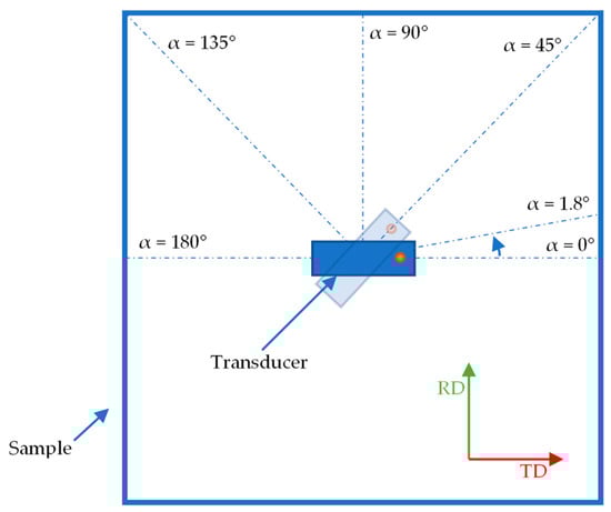 The measurements were made for the transducer’s 101 angular arrangement α within the (0°–180°) range, following a constant step of 1.8°. Figure 1 shows a schematic diagram of the sample with the visualization of the position of the transducer at the 0°angle and marks of the direction of further rotation (depicted with a blue arrow). The first measurement was conducted for the transducer aligned along the 0° angle (the transverse direction TD), which means that magnetization was perpendicular to the rolling direction (angle α = 90° is the angle parallel to the rolling direction RD).