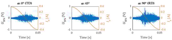 The exemplary results of UBN burst along with the magnetizing current Ie obtained for the 0, 45 and 90 degree positions of the transducer with respect to the TD are presented in Figure 2. One can clearly notice the difference in the course and dynamics of the observed Barkhausen effect depending on the alignment of the transducer. The greatest activity, especially in the context of the dynamics and the value level of the main MBN peak, can be observed in the 90° direction (RD). This refers to the easier conduction of the magnetization course. As the dynamics of the process changes, the analysis of the combined domains of time and frequency can be useful. This was also shown earlier by authors in [20,21], where the possibility of the utilization of selected time-frequency transformation to MBN signal for the evaluation of anisotropy was deeply discussed. The observed differences of the course of the phenomenon make it possible to effectively conduct the process of assessing the anisotropic properties of steel.