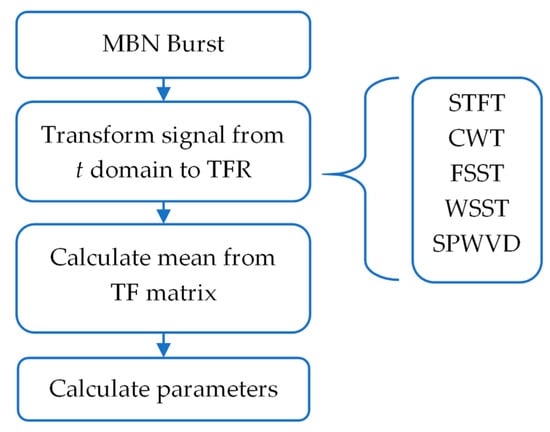 The diagram in Figure 3 shows the complete process of the UBN signal TF analysis. Two main stages can be distinguished. The first refers to the computations of six TFRs by applying all considered methods and their configurations for each analyzed MBN signal. During the second stage, the feature extraction procedure was applied, allowing for the definition of several TF parameters for each obtained TF distribution. The procedure of processing the UBN signal was the same for all transformations.