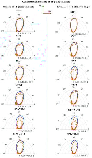 Due to the difficulty in the qualitative comparison of some transformations, a quantitative analysis was performed. For this purpose, the features extraction procedure was applied on the obtained TFRs. In Figure 5, the distribution of two selected parameters were shown as a function of angle α: the measure of the concentration of TFR—BNTF_CM (on the left side) and the average value of TFR—BNTF_MEAN (on the right side). The BNTF_CM was chosen because it allows one to generalize the information contained in the TFR well. This parameter takes a higher value when the TFR is uniform. However, it is also insensible to low values of TFR. The second parameter, BNTF_MEAN, is a standard statistical parameter describing the average value of a distribution. The formulas of both parameters are presented in Table 4. The authors provided a wide description of possible methods of parametrization of TFR in their previous publication [19,20]. Considering the angular distribution of the parameters obtained for the STFT spectrogram, the base approximation was determined. It was treated as a reference characteristic that allowed for a mutual comparison of the obtained TFRs by all considered transformations. To quantify the deviation between the characteristics of TF parameters and the reference approximation, the coefficient of determination r2 was calculated. The formula is given in Table 4, where refers to the value of parameter for the i-th angle, is the value of approximation for i-th angle and is the average value of parameter. Data were normalized for each case to the [0, 1] range.