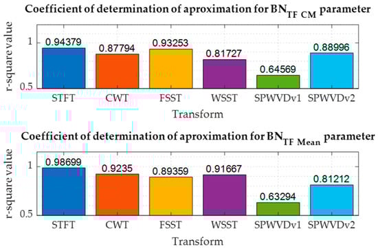In Figure 6, the bar plot showing the value of coefficient of determination r2 for both analyzed TF parameters is presented. For both parameters, the highest value of the r2 coefficient was achieved for the STFT. The lowest value was obtained for both versions of the SPWVD transformations. However, the coefficient r2 for the BNTF_MEAN parameter was higher by 28.32% for SPWVDv2 than for SPWVDv1. In the case of BNTF_CM, this percentage difference was even greater and equal to 37.83%. It proves that the transformation of the SPWVD may provide better results after releasing the limitations of the computation parameters. Transformation in which the synchrosqueezing method was implemented achieved worse results than their base methods. Comparing the STFT and the FSST, the percentage change of 1.20% and 10.45% was obtained, respectively, for the distribution of the BNTF_CM and BNTF_MEAN parameters. The CWT in relation to the WSST has a better fit in terms of the r2 coefficient for BNTF_CM by 7.38%, and for BNTF_MEAN by 0.74%.