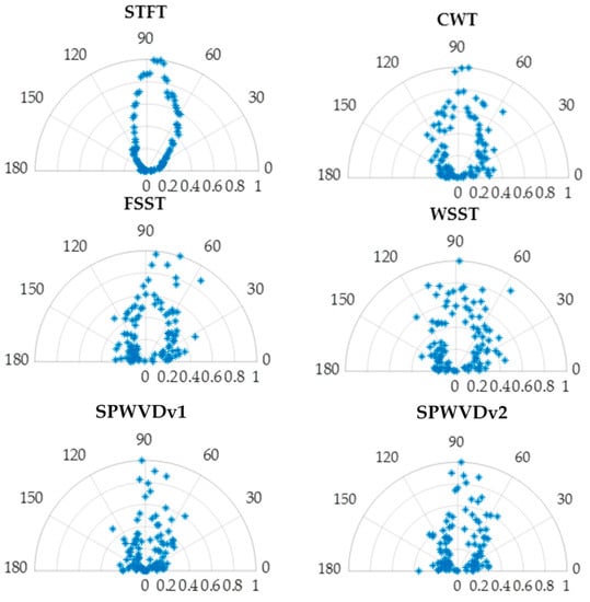 As it can be seen in Figure 5, generally, both parameters’—BNTF_CM and BNTF_MEAN—values for all transformation increase while the angle is growing α from 0° to 90°. Then, both start to decrease. The characteristics of the TF parameters calculated from the STFT are highly correlated with the approximation (depicted with the blue continuous line on plot). In the case of other transformations, the significant local deviation from the approximation line can be clearly noticed, which may indicate a lower robustness of these transformations. In the case of SPWVDv2, a much more stable change in value relative to the angle was achieved than in case of SPWVDv1 as, along with increasing resolution both in frequency and time, the stability of the characteristics increases. The FSST-based characteristics have a similar trend as the ones for the STFT, although the values for the FSST-based TF parameters have a greater deviation from the approximation characteristic.
