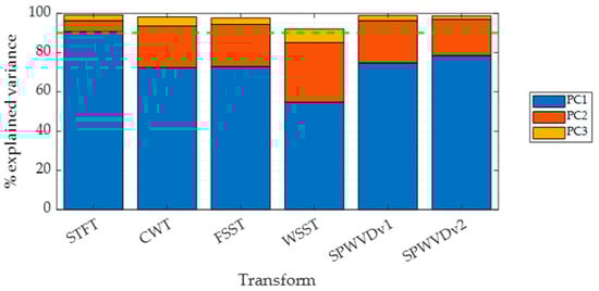 Due to the different mathematical foundations of the analyzed transformations, the information about the studied material (after the transformation) may ultimately be expressed in a different way in the given TF distribution. In consequence, it reflects in different properties of the TFR for a subsequent processing method. Therefore, one or two parameters describing the properties of these representation (e.g., relating to statistical parameters) may not be able to provide complete information about the observed properties changes. In such a situation, the need of using one of the methods of the Exploratory Data Analysis (EDA) is arising. The Principial Component Analysis (PCA) is one of such a method that enables the assessment of information variability in the entire database. Therefore, it was applied to evaluate the variance of vector, consisting of multiple TF parameters values gathered within the entire range of analyzed cases. The PCA leads to the linear transformation of the dataset so that the most variability of the input vector is presented in the new vector by fewer of its features called principal components pc (being a linear combination of the original parameters). In this case, the PCA analysis provides data on how the information is distributed over the new parameters (pcs) vector. As a result, the greatest variability is provided by the first component, and the higher the index number of the pc, the lower rate of variability it explains. Several results can be expected when using this data analysis method. If most of the data variance is expressed with the first or a few first principal components, then there is a large correlation between the parameters inside a vector. In the second case, when a high variability rate is reached under the term of several first principal components, then this may refer to the situation in which each of the underlying features provides unique information. However, on the other hand, it may also be the result of a case where the parameters are correlated, although they are supplemented by the interfering components that add variability to the input TF parameters vector. During the analysis, eleven TF parameters were taken into account, such as skewness, standard deviation, power density and entropy of the TFR (according to [19]). In Figure 7, the first principal component for each of the transformations is presented. The total variance of data within the parameters vector is shown in Figure 8.