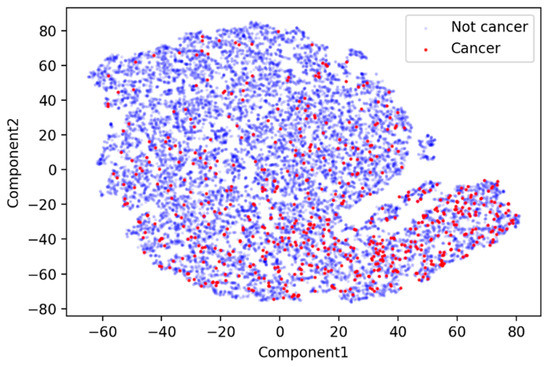 To explore and understand the characteristics of the data set used in this study, two-dimensional visualization was performed using t-Stochastic Neighbor Embedding (t-SNE) [34], as shown in Figure 1. t-SNE reduces high dimensional data to a two-dimensional space, i.e., component 1 and component 2, while preserving the distance between points in the high dimensional space. The red spots in Figure 2 represent gastric cancer patients, and the blue spots represent atrophic gastritis patients. From the visualization of our data set, we found that the complexity of boundaries separating classes was extremely high, and the problem of class imbalance was serious.