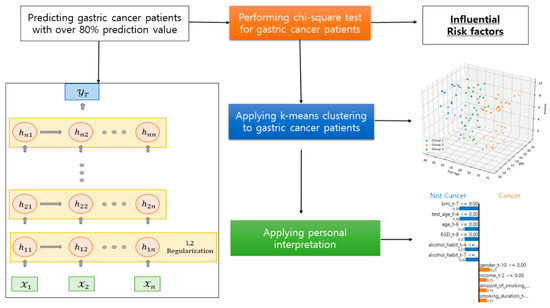 In this paper, we present DeepPrevention, which consists of a prediction module and an explanation module. The prediction module performs a deep recurrent neural network (RNN)-based prediction, which predicts the probability that atrophic gastritis will develop into gastric cancer. The explanation module explains the prediction results, which identify risk factors for progression to gastric cancer from atrophic gastritis using the Chi-squared test. Furthermore, it detects high-risk patients who have a high probability of progressing to gastric cancer using K-means clustering [23]. Finally, the explanation module provides a personal explanation of the prediction using a local surrogate called LIME [24].