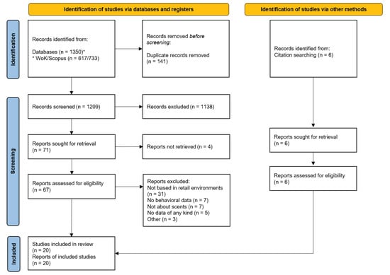 Twenty studies met the inclusion criteria and were included in this review (Table 1). The most common reason for exclusion was that studies were not based on actual retail environments (Figure 1), although it should be mentioned that most papers included laboratory-based assessments in addition to the actual retailing environment (e.g., [27,29]), usually to isolate causal mechanisms and/or to document the perceptual properties of the target odors in controlled conditions. In such cases, only the results involving actual retail environments were included for the in-depth review.