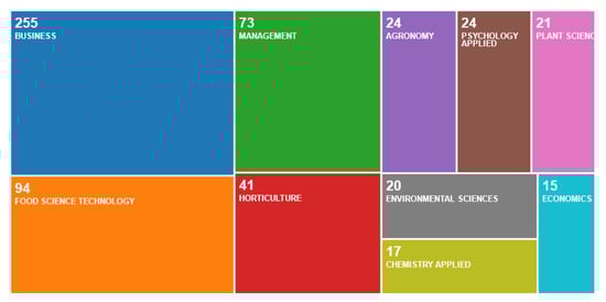 The search yielded, respectively, 617 records on Web of Science and 733 records on Scopus. The records came from a wide variety of research fields, with business, management, food science and technology being the fields most represented (Figure 2). The database search further supplemented by a manual search using the “snowballing” method, from which additional six records were found (Figure 1). Complete documentation on this process and the full list of records are available as Supplementary Materials to this paper.