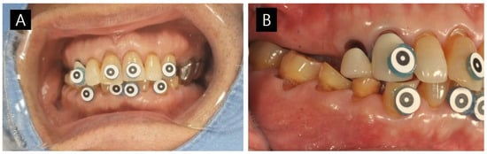 (A) Target tracking materials are attached to the labial surface of the upper and lower anterior teeth. (B) The restoration space is insufficient on the lateral side after losing the antagonist teeth.