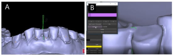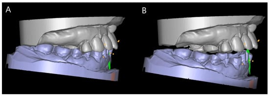 When the patient closes his mouth to the tooth contact position, it is possible to check whether a sliding motion occurs at the first contact position and the presence of CR–MI discrepancy can be checked (Figure 3A). If such a discrepancy is present, a horizontal trajectory (between two green dots) appears and its size can be measured by tracking software (Ezscan8; Medit Corporation, Seoul, Korea). Additionally, then it can be exported by specifying the positions of the maxilla and mandible in the centric relation position (Figure 3B). The centric relation recording followed the chin-point guidance method among the traditional methods and the target tracking method was used instead of the bite registration material in the step of recording the relationship between the maxilla and the mandible at the CR position.
