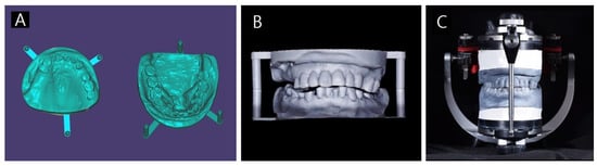 (A) Designing a flexible bite jig consistent with the altered vertical dimension for mounting the plaster cast. (B) The 3D printed bite jig for the gypsum cast mounting process constructed from flexible resin. (C) Mounting the plaster model on the mechanical articulator using the flexible bite jig.