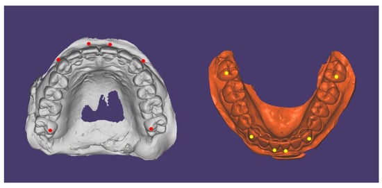 Preliminary study data for evaluating tracking accuracy according to the arrangement of targets were presented. The static model mounted on the articulator was recorded using the optical scanner while closed position and 4 mm (distance of tip of upper and lower central incisors) opened position. Targets were attached to the maxillary and mandibular central incisors and canines. The accuracy of target tracking was evaluated at maxillary and mandibular anteriors and the mesio-buccal cusp of the 2nd molars (Figure 8). Tracking data for 7 s at 50 frames per second was acquired and a total of 350 frames of data were recorded and compared with reference coordinates.