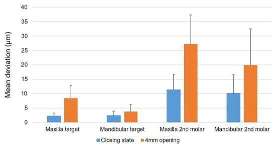 The mean deviation at the closing state was smaller than that of the 4 mm opening state. The mean deviation of maxillary and mandibular anterior points were smaller than that of the maxillary and mandibular 2nd molar. The accuracy of the tracking data was within 10 μm in the anterior target region and within 30 μm in the cusp of the second molar, confirming that it showed very high accuracy in all environments (Figure 9).