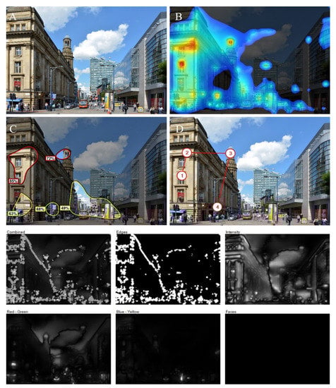 Figure 1, using a photograph from the center of Manchester, UK at the junction of Market and Cross Streets, shows the full analysis output of the 3M-VAS software. In subsequent scans not all data will be shown. Here, we see a typical situation in real street scenes: minimalist glass-façade buildings are more or less ignored, despite their dominant size. The neoclassical building of the Royal Exchange Theatre from the 1860s on the left is practically the sole focus of pre-attentive attraction, with main “hotspots” in areas of rich detail. There is also some attraction to the road level with people and cars, to the edge of a cloud and, to a much lesser degree, to some reflections and other areas of contrast in the modernist-style buildings. As analyzed by the software, the edges, which are represented by sharp intensity contrasts, are the most important parameters in this case. The shaded area of the building does not attract, hence it is not well represented in the heat map (this is an artifact of the software, which privileges better-illuminated portions of a visual).
