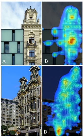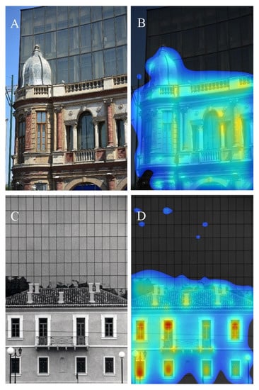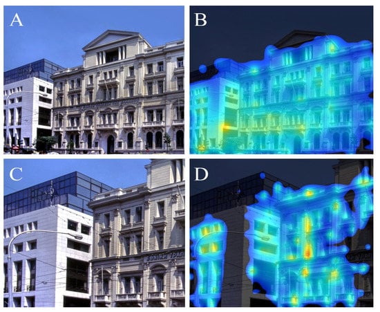 Figure 3 analyzes a color photograph of a 1920s building with a glass façade building directly behind it in Hasanabad square, Tehran, Iran (A/B); and a black and white photograph of an 1830s building with a glass façade directly behind it in Panepistimiou Street in Athens, Greece (C/D). The old buildings are of different styles, and the two photos also differ in that one is in color and the other one in black and white. However, the comparative results are identical, with the glass façade behind completely ignored in each case, while the heatmap distributes practically over the whole pre-modern building, with hotspots at windows or other appropriate structural details.
