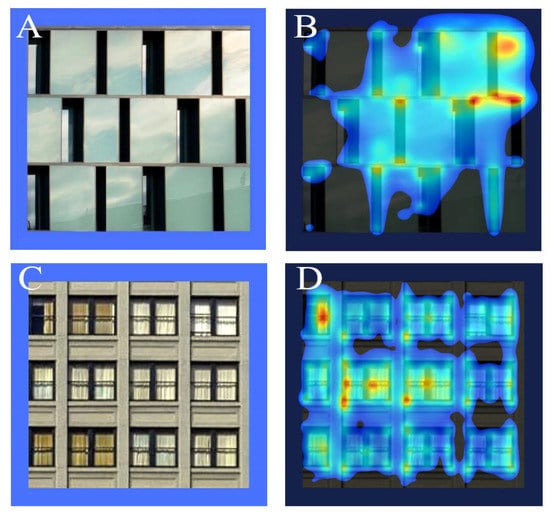 Figure 5 shows partial, equal size views of the modernist-style buildings in Figure 4 isolated from their more traditional neighbors. The glass façade building from Brno (A/B) contains some hotspots where the reflections from the sky are brighter and the contrasts with the shadows are more pronounced, but its heatmap has many gaps. Because this façade’s design pursues a visual style that deliberately eliminates nested symmetries, the gaze interest becomes fragmented []. The building from San Diego (C/D), although not ornate, has a regular distribution of windows, and each window is framed in an easily recognizable way. The single railing behind every window, and the shadow it casts on the curtains, create another point of regularly spaced points of contrast. All this tectonic sub-structure results in a more even distribution of the pre-attentive gaze heatmap.
