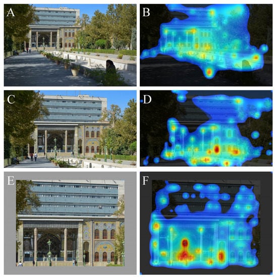 Figure 7 shows a view of the Royal Balcony with the Marble throne, one of the buildings of the Golestan Palace complex in Tehran, Iran dating from the 18th century. This building is near the border of the complex, and a tall modernist-style office building can be seen from across the street behind it, providing a chance juxtaposition. Zooming into the scene, we see that the palace building retains overall interest, whereas the heatmap become more fragmented for the modernist-style building, the closer in we come (C/D, E/F). It is the high degree of organized complexity of the older palace that keeps our attention. People shown in the images are also major attractants, complicating a strict analysis of the architectural geometry, as previously noted [].