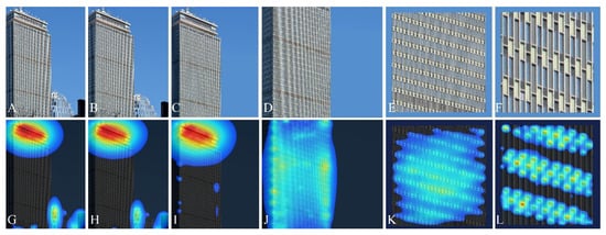 Figure 8 analyzes a photograph of the Prudential Tower in Boston, built in the International Style in the 1960s. This very large building is almost completely ignored, with the exception of the top floors, which are morphologically distinct from the rest, and create visual contrast. The second “hottest” point is a small part of the morphologically more complex 111 Huntington Avenue building, seen on the right at a distance (A/G). Removing the lettering from the top floors of the Prudential Tower does not cause any change (B/H), and neither does cropping the bottom part, which removes the 111 Huntington Avenue building competing for attention (C/I). Zooming in, the Prudential building is more or less uniformly explored (D/J) as its details become more visible and all other points of gaze attraction are excluded, but this uniformity disintegrates as we move further in, and the monotonous repetition is clearly revealed (E/K, F/L).