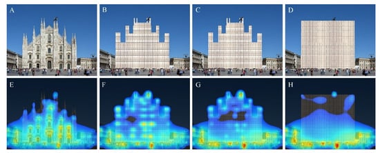 In Figure 9, in a photograph of Piazza Duomo in Milan, Italy (A), the Duomo Cathedral has been replaced by a curtain wall face of similar color (B) that gets progressively simpler, first by losing one set of horizontal lines per floor (C). In the same simplifying sequence, the façades progressively abandon the complex fractal skyline of the original building for a square profile (D). The heatmap coverage diminishes with decreasing complexity. The people, the flying pigeon, and the surrounding buildings are always within the heatmap, but become gradually “hotter” as the central object building attracts less and less coverage.