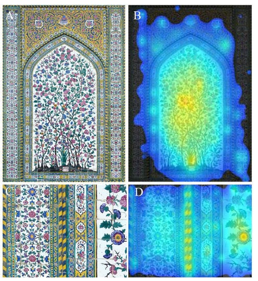 A complete tiled ceramic mural from the 18th century Vakil mosque in Shiraz, Iran (A), with its eye-tracking simulation heatmap (B). On closer approach, more details become visible (C), so that the new eye-tracking simulation heatmap remains uniformly coherent (D).
