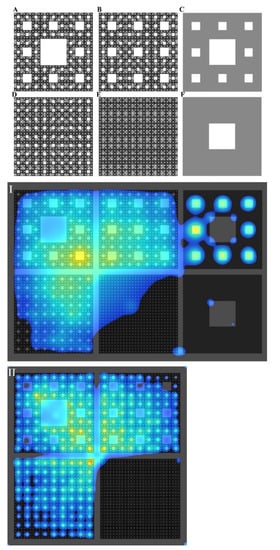 In Figure 11, the Sierpinski Carpet geometrical fractal is analyzed (A), then with missing either large (B, D, E) or small-scale levels (C, F). All versions were tested together, as one image. It was important to compare the relative ranking among versions showing different degrees of fractal scaling. The result is quite instructive. Those versions where levels of scale are missing are covered less by the heat map, with the more simplified versions E and F receiving the least coverage. Interestingly, the diagonal low-level coverage of E seems to be related to the presence of C in the same test. When only A, B, D, E are tested together, the avoidance of the rather monotonous E is more pronounced (II). The eye is engaged by obvious hierarchical scaling.