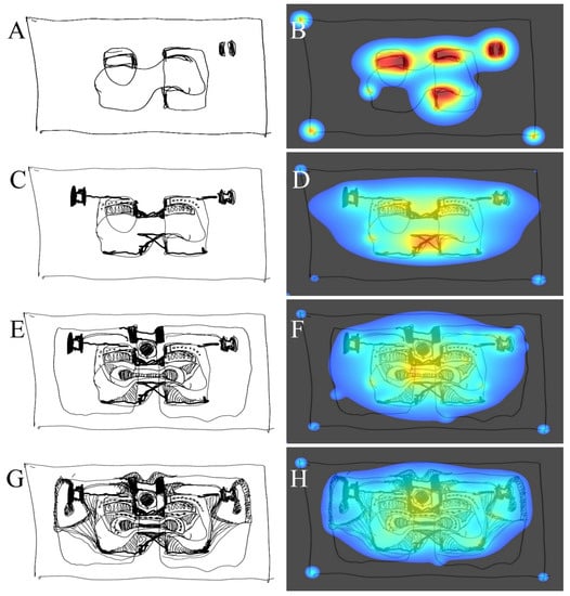 A sequence of drawings with contrast, detail, and local symmetries increasing dramatically. Sequence (A,C,E,G) fills out a drawing with increasing detail and approximate, overlapping symmetries. Sequence (B,D,F,H) represents the corresponding eye-tracking simulation heatmaps, which lose their hotspots as they become more and more uniformly coherent.