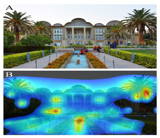 (A) The Qavam House from the 1870s, situated in the Eram Gardens in Shiraz, Iran. (B) Eye-tracking simulation heatmap.