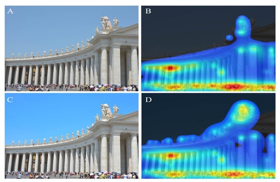 In Figure 14, a partial view of the colonnade in St Peter’s square in the Vatican, Rome, is presented in lower (A) and higher (C) saturation and contrast. In the original photo (A) the contrast between the statues and the sky is not enough for the software to include them in the heatmap (B), whereas after enhancing contrast and saturation (B), parapet statues are included in the uniform field of visual attention (D).