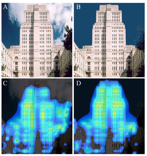 Figure 15 provides another demonstration of how contrast influences a scan, using a photograph of the London University Senate House dating from the 1930s. Here, the white clouds (A) do not contrast with the top part of the white building, consequently leaving it completely outside the 3M-VAS heat map (C). When the clouds are replaced by a solid blue color taken from the sky in the original photo (B), then the top of the building registers (D) much better in the visual attention scan.