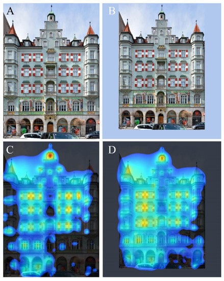 In Figure 4, the Omega Palace department store building from the 2000s connects to the House of Four Giants from the 1900s, in Freedom Square in Brno, Czech Republic (A/B); and the 1880s Louis Bank of Commerce building on 5th Avenue, San Diego, California is in front of a more recent building with symmetric distribution of openings in the background (C/D). In both cases, the gaze is attracted to the pre-modern building, but unlike what we see in Figure 3, a small part of the heatmap also extends to the newer building.