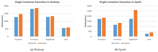 Figure 2 shows the performance evaluation results of running a single container with “Baseline” and “Adaptive” (as described in Section 4.1) for Hadoop and Spark, respectively. As we can see from the results, the overall execution times increased in the Adaptive approach. For the K-means benchmark, the execution time increased by only 3% compared to the optimal result (Baseline) when using the Hadoop resulting in the lowest variation (as seen from Figure 2a). However, in the case of PageRank benchmark in Spark, the execution time increased by almost 50% with the largest variation, as depicted in Figure 2b.