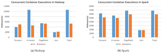 In the case of applications where the overall execution time increased compared to the Fair approach (e.g., Terasort and Join in Hadoop as seen from Figure 3a), the workload is typically divided into several execution steps so that, between those steps, other running containers may have acquired idle computing resources. This can be an interesting trade-offs of making the monitoring and adjusting cycles short (in our case, 3 s, as discussed in Section 3.2). If there are idle cycles longer than our predefined monitoring period between multiple steps of a Big Data job, allocated computing resources can be redistributed to other containers even though that Big Data job has not been completely finished yet. Nevertheless, based on the effective vertical elasticity management of Docker containers, our proposed scheme can achieve aggregated performance improvements by 50.1% and 13.7% in Hadoop and Spark, respectively (as seen from “Total” in Figure 3a,b) for representative Big Data workloads. Table 4 and Table 5 show the summarized experimental results for single-container executions and concurrent container executions, respectively.