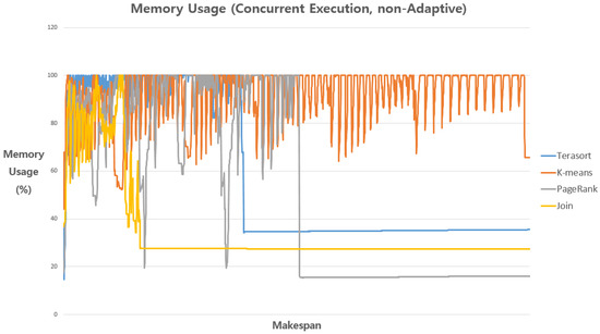 Figure 4 and Figure 5 show the resource utilization patterns of the “Fair” and “Adaptive” approaches in terms of main memory usages. As we can see from the results, the Fair approach cannot utilize available resources whenever a job is completed, which results in a waste of allocated computing resources and increased makespan even compared to the “Baseline”. On the other hand, our proposed Adaptive approach can effectively leverage idle computing resources during the course of job executions, which can result in improved resource utilization and makespans, as depicted in the exemplary case of K-means benchmark (Figure 5) and Figure 3.