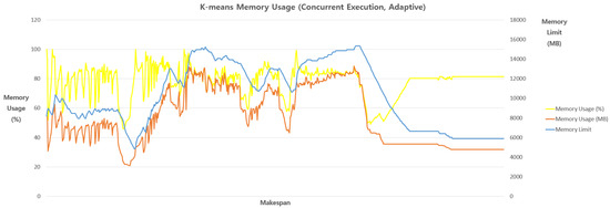 Memory usages in the K-means benchmark in the Adaptive approach to show an exemplary case of efficient resource usage patterns.