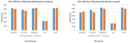Docker not only can limit the maximum CPU usage of a container based on CPU time but also supports the method of limiting the use of only specific CPUs by setting a fixed set of CPU thread numbers (called “CPU Affinity”) [30]. In the case of conventional CPU time-based approach, since the CPUs being used can continuously change, the overhead of context switching may occur. Therefore, in order to investigate the effects of CPU pinning (i.e., setting the CPU affinity) on Big Data workloads, we performed other experiments, as seen in Figure 6. We compared our basic adaptive resource allocation scheme (Adaptive) with the modified CPU allocation method from time sharing to affinity (Adaptive-affinity).