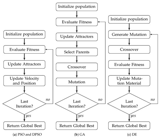 where with random permutation and otherwise. G is the length of the genome, and denotes a random choice of X elements of G without replacement, while is with replacement. Gene mutation for each child is determined by a random permutation with replacement , where is the maximum allowed percent mutation a genome can undergo (the minimum is one mutated genome). For each unique gene/dimension selected for mutation, a uniform random value within the respective limits is applied. The general process flow for GA is shown in Figure 1b. The individual fitness calculation time complexity is , parent selection which shuffles and fully utilizes the current population is , a random permutation of the genes for each child is , crossover with full replacement is , mutation is , and each dimension limit check is , resulting in a total time complexity per iteration of .