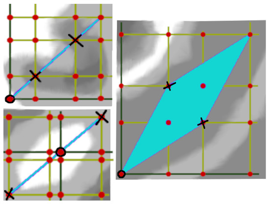 where and denote the respective probability of activation. It must be stressed that and are evaluated on a per-dimension basis, as opposed to being a single value applied to each dimension. Although this discretized approach reduces the coverage of points between the two known best locations, it increases the exploration of points in the surrounding neighborhood (see Figure 2). When momentum and noise injection are accounted for, the individual is less likely to become fixated on a single vector and can partially explore the area around each point. Without noise or momentum, the probability of moving to a given point is based on the products of , , , and/or for each dimension. For the top-left example in Figure 2, if the lower ‘×’ marks the global optimum, the point in the top left corner would have the following transition probability