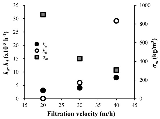 The results of the kinetic model in Figure 3 revealed an increase in ka and kd, along with a decrease in σm, with increasing filtration velocity. Moreover, a good fit to the measured results was obtained for each filtration velocity, with a correlation coefficient (r2) of 0.98−0.99, thus suggesting that the kinetic model is useful for describing the overall performance of the system. In detail, the ka values are seen to be 3.16 × 10−5, 4.09 × 10−5, and 7.93 × 10−5 h−1, with corresponding kd values of 0.07 × 10−5, 6.03 × 10−5, and 29.18 × 10−5 h−1, and σmax values of 901.20, 428.95, and 306.81 kg/m3, at filtration velocities of 20, 30, and 40 m/h, respectively. The decrease in σm is attributed to an increased probability of detachment of the accumulated SS from the media with an increasing amount of accumulated SS and with increasing filtration velocity, the latter leading to higher shear stress and hydraulic gradient [37]. This conclusion is supported by the significantly greater increase in kd relative to ka, with increasing filtration velocity.