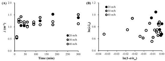 For the deep bed filtration model, the time evolution of the parameter λ with varying filtration velocity is indicated in Figure 4A. Here, similar λ0 values of 0.536, 0.590, and 0.575 m−1 were obtained for filtration velocities of 20, 30, and 40 m/h, respectively. This demonstrates that λ0 is independent of the filtration velocity and SS concentration, in agreement with the results of a previous study [39]. Moreover, the λ values obtained in the present study are seen to vary in the ranges of 1.031−1.525, 1.088−1.510, and 1.001−1.313 m−1 at filtration velocities of 20, 30, and 40 m/h, respectively, which is also in agreement with previously reported ranges of 0.8–269.24 m−1 (for 0.24−0.36 mm Ottawa sand) [40] and 140–191 m−1 (for 0.227 mm sand) [47]. However, the results in Figure 4B indicate that the correlation between the λ and σ parameters that was proposed in Equation (6) is absent. This is attributed to the variation in the SS concentration of the effluent due to the significant heterogeneity in the amount of influent SS. The λ value is influenced by time as well as pore space; hence, λ varies with variations in the operation time, bed depth, and pore structure of the media layers [48].