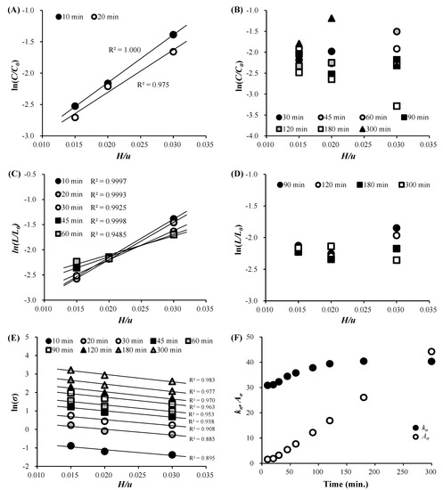 The k-C* model: (A,B) the corrrelation between ln(C/C0) and H/u during system operation times of (A) 10−20 min and (B) 30–300 min; (C,D) the correlation between ln(L/L0) and H/u during system operation times of (C) 10−60 min and (D) 90–300 min; (E) the correlation between ln(σ) and H/u; (F) the time evolution of kσ and Aσ.