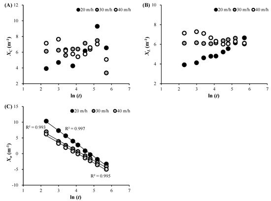 Overall, an increase in the XL value with increasing filtration velocity is observed during the initial 10−60 min of operation, thus suggesting an increased amount of blockage with increased inlet SS load [16,46]. Nevertheless, the present results indicate a convergence of the XL towards similar values regardless of the filtration velocity as the operation period is increased. Thus, the average and standard deviation of the XL values at operating times of 180−300 min are 6.31 ± 0.27 m−1 for the flowrate range of 20−40 m/h. This indicates that similar levels of SS deposition and blockage of the media layer are eventually reached (given sufficient operation time) regardless of filtration velocity.