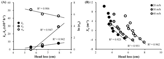 The results described above indicate that the specific SS deposit (σ) is useful for describing the SS removal for the media layer used in the present study (Figure 5E,F and Figure 6C). Hence, various parameters related to the specific deposit, such as ka, kd, σm, and Xσ, can be correlated with the head loss, as shown in Figure 7. As reported previously, the total head loss in the media layer increases from 3.0 to 5.5 cm, from 4.2 to 6.5 cm, and from 5.6 to 7.9 cm, at flow velocities of 20, 30, and 40 m/h, respectively [20]. In the present work, the parameters ka, kd, and the natural logarithm of σm exhibited good correlations with the final head loss (Figure 7A). In particular, ka and the kd are seen to increase, while ln (σm) decreases as the final head loss increases. The increased ka indicates that an enhanced SS deposit in the media layer leads to a decrease in the amount of pore space due to the SS accumulation therein. By contrast, the increased kd indicates an increased possibility of re-dispersion with increased SS deposit (σ) in the media layer [24,37]. This conclusion is supported by the observed decrease in σm with increasing head loss (i.e., with an increasing amount of SS deposit). In addition, the results in Figure 7B indicate that the final head loss decreases with increasing Xσ. As reported previously, both a higher head loss and a lower Xσ indicate a decreased SS permittivity and a more significant level of blockage [16]. Moreover, the previous studies report a linear correlation between the head loss and Xσ for Xσ values of <3, with fluctuations in the head loss at Xσ > 3, probably due to the re-dispersion of the deposited SS [38]. The present and previous results thus support the conclusion that an increased level of SS deposition is accompanied by an increased probability of re-dispersion.