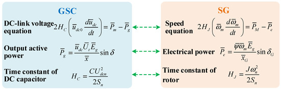 In Figure 1, the DC-link voltage of the GSC has a similar dynamic equation with the rotated speed of the SG. In the same way, the modulation voltage amplitude of the GSC shows similar dynamics compared with the magnetic linkage of the SG. Similarly, the inertia constant, HC, of the capacitor also exhibits similar dynamic characteristics to the inertia constant, HJ, of the SG’s rotor. These above similarity relationships between the GSC and the SG are shown in Figure 2. It should be noted that these physical quantities in Figure 2 have similar dynamic characteristics, but they are not equal.