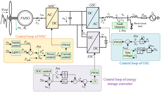 According to the kinetic similarity relationships between the GSC and the SG, as shown in Figure 2, the control structure of the PMSG-based wind turbine with additional energy storage is designed in Figure 3. This paper is based on our previous work [20], and more detailed descriptions about the control structure of the VS-controlled wind turbine can be referred to in [20]. The GSC realizes the autonomous grid synchronization based on the dynamics of the DC-link capacitor. When the short-circuit fault occurs in the grid, the virtual resistor control is added to the GSC’s control loop to suppress the overcurrent. The MSC still adopts the vector control method based on the orientation of the rotor flux linkage. The auxiliary energy storage device realizes the function of primary frequency regulation. In addition, the energy storage device can also maintain the DC-link voltage within the feasible range.