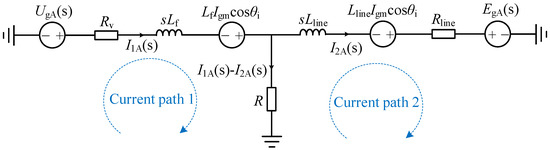 According to Figure 4, taking the phase A as an example, the equivalent circuit diagram of the grid-connected wind turbine system in the s domain after the three-phase short-circuit fault occurs is shown in Figure 5, where the grid voltage is EgA(s), the equivalent AC-side voltage of the wind turbine is UgA(s), the output current magnitude of the wind turbine before the short-circuit fault is Igm, the output current of the wind turbine after the short-circuit fault is I1A(s), and the grid-side current is I2A(s). The time-domain grid voltage, egA, of the phase A can be expressed as